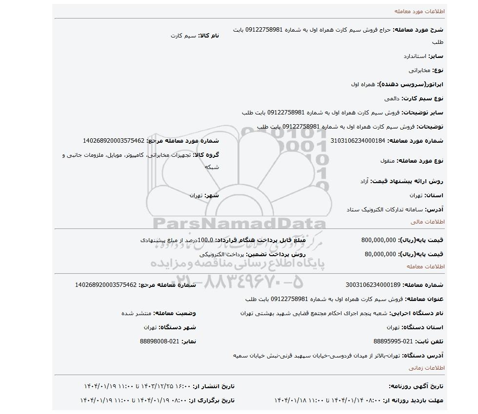 | عنوان معامله: فروش سیم کارت همراه اول به شماره 09122758981 بابت طلب | ||