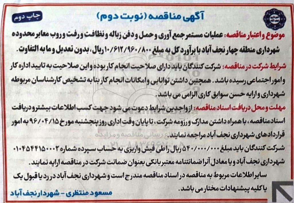 موضوع و اعتبار مناقصه: عملیات مستمر جمع آوری و حمل و دفن زباله و نظافت و رفت و روب محدوده شهرداری منطقه چهار شهرداری نجف آباد با برآورد اولیه به مبلغ 10.612.960.800 ریال بدون تعدیل و ما به التفاوت