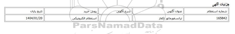 | 165842 | ترانسفورماتور تکفاز | استعلام الکترونیکی | 1404/01/20 |