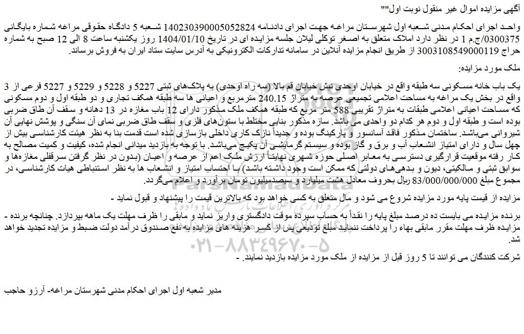 واحد اجرای احکام مدنی شعبه اول شهرستان مراغه جهت اجرای دادنامه 140230390005052824 شعبه 5 دادگاه حقوقی مراغه شماره بایگانی 0300375/ج.م 1 در نظر دارد املاک متعلق به اصغر توکلی لیلان جلسه مزایده ای در تاریخ 1404/01/10 روز یکشنبه ساعت 8 الی 12 صبح به شماره حراج 3003108549000119 از طریق انجام مزایده آنلاین در سامانه تدارکات الکترونیکی به آدرس سایت ستاد ایران به فروش برساند.