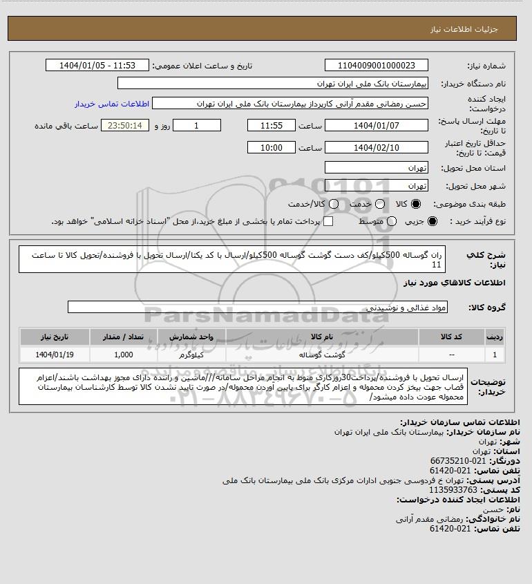 شرح کلی نیاز: ران گوساله 500کیلو/کف دست گوشت گوساله 500کیلو/ارسال با کد یکتا/ارسال تحویل با فروشنده/تحویل کالا تا ساعت 11
