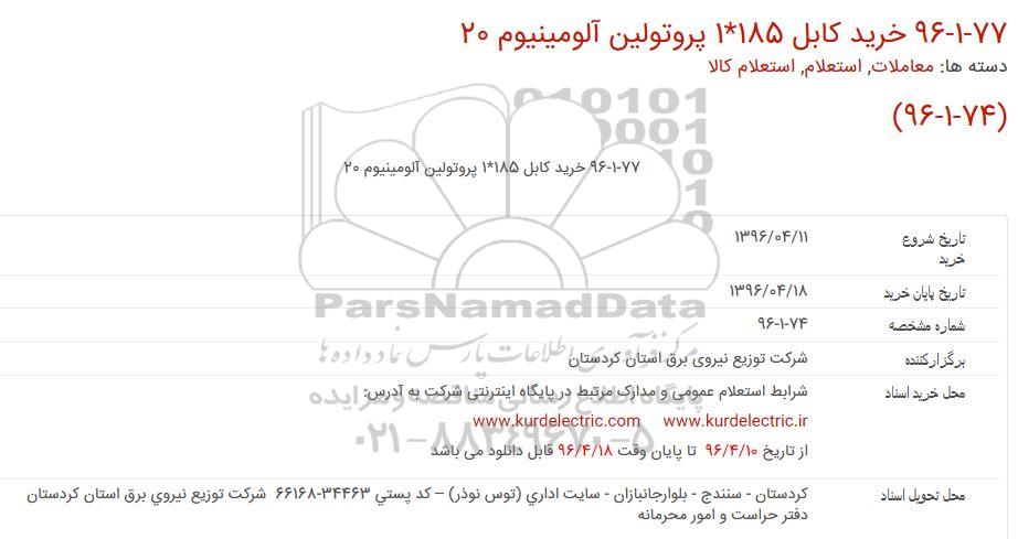 استعلام بها و موضوع استعلام استعلام، استعلام خرید کابل 185*1 پروتولین آلومینیوم 20 به اطلاع کلیه شرکتها و افراد متخصص واجد شرایط میرساند، آگهی گذار در نظر دارد از طریق استعلام بها، نسبت به انتخاب و دریافت پیشنهادات اقدام نماید. این استعلام با کد آگهی ثبت شده در سامانه خبرگزاری پارس نماد : 881492 منتشر شده است. مشخصات استعلام : تاریخ شروع استعلام: 1396/04/11 آخرین مهلت ارسال پیشنهاد قیمت : 1396/04/18 و محل اجرای پروژه : استان کردستان میباشد. استعلام قیمت مورد درخواست : استعلام، استعلام خرید کابل 185*1 پروتولین آلومینیوم 20 با دستهبندیهای تخصصی و گروه های مرتبط : سیم و کابل, تجهیزات برق و الکترونیک, استعلام اطلاع رسانی میگردد.