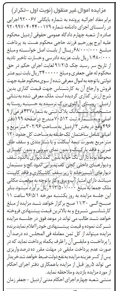 مزایده ملک به مساحت 302.96مترمربع نوبت اول شماره بایگانی 920067