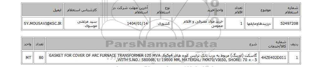 | 52497208 | درزبندهاوعایقها | 1 | خرید مواد مصرفی و اقلام عمومی | کشوری | 1404/01/14 | سید مرتضی موسوی | SY.MOUSAVI@KSC.IR |