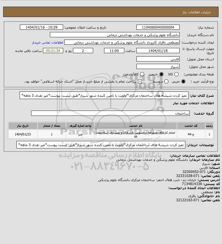 شرح کلی نیاز: تمیز کردن شیشه های ساختمان مرکزی*اولویت با تامین کننده شهر شیراز*طبق لیست پیوست*غیر نقدی 3 ماهه*