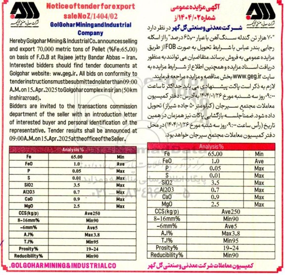 شرکت معدنی و صنعتی گل گهر در نظر دارد 70 هزار تن گندله سنگ آهن با عیار 65 درصد را از اسکله رجایی بندرعباس با شرایط تحویل به صورت FOB از طریق مزایده عمومی به فروش برساند. متقاضیان می توانند به منظور دریافت اسناد مزایده و همچنین اطلاع از شرایط مزایده به سایت www.geg.ir بخش مناقصه و مزایده مراجعه فرمایند.