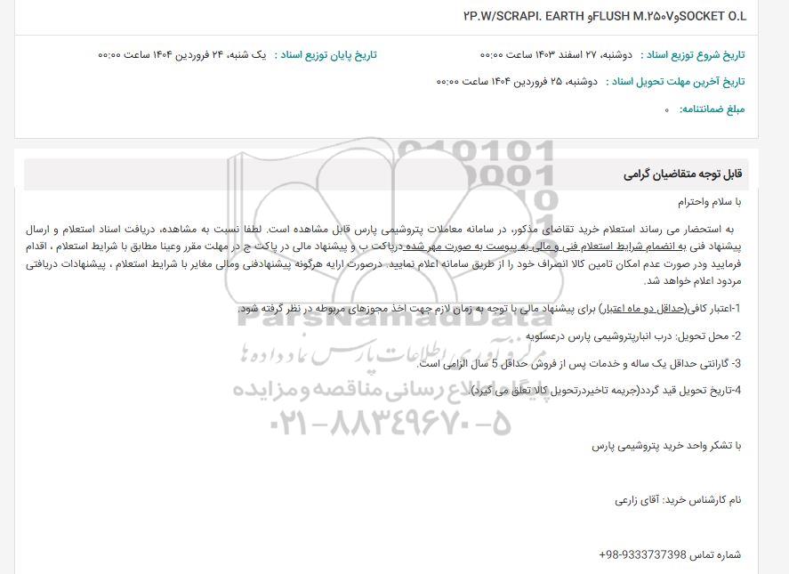 به استحضار می رساند استعلام خرید تقاضای مذکور در سامانه معاملات پتروشیمی پارس قابل مشاهده است. لطفا نسبت به مشاهده، دریافت استاد استعلام و ارسال پیشنهاد فنی به انضمام شرایط استعلام فنی و مالی به پیوست به صورت بهر شاه در پاکت به و پیشنهاد مالی در پاکت و در مهلت مقرر وهينا مطابق با شرایط استعلام، اقدام فرمایید و در صورت عدم امکان تامین کالا انصراف خود را از طریق سامانه اعلام نمایید. در صورت ایرانه هر گونه پیشنها دفتی و مالی مغایر یا شرایط استعلام و پیشنهادات دریافتی مردود اعلام خواهد شد.