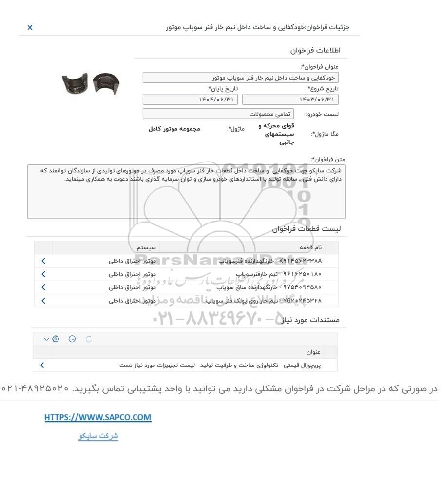 متن فراخوان: شرکت ساپکو جهت خودکفایی و ساخت داخل قطعات خار فنر سوپاپ مورد مصرف در موتورهای تولیدی از سازندگان توانمند که دارای دانش فنی، سابقه تولید با استانداردهای خودروسازی و توان سرمایه گذاری باشند دعوت به همکاری می نماید..