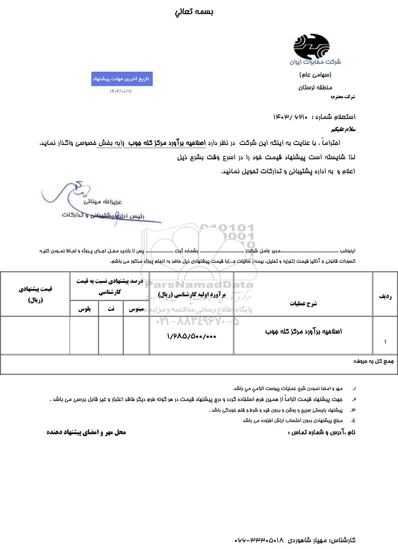 احتراماً ، با عنایت به اینکه این شرکت در نظر دارد اصلاحیه برآورد مرکز کله جوب را به بخش خصوصی واگذار نماید. لذا شایسته است پیشنهاد قیمت خود را در اسرع وقت بشرح ذيل اعلام و به اداره پشتیبانی و تدارکات تحویل نمائید.