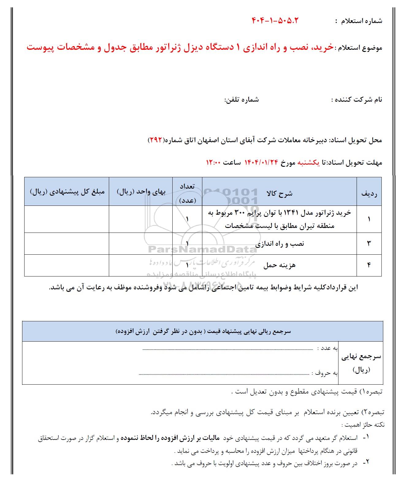 موضوع استعلام: خرید ، نصب و راه اندازی 1 دستگاه دیزل ژنراتور مطابق جدول و مشخصات پیوست