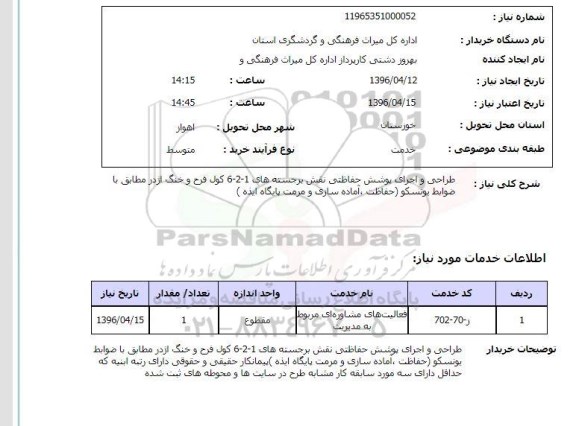 توضیحات خریدار: طراحی و اجرای پوشش حفاظتی نقش برجسته های 1-2-6 کول فرح و خنگ اژدر مطابق با ضوابط یونسکو (حفاظت، آماده سازی و مرمت پایگاه ایذه) پیمانکار حقیقی و حقوقی دارای رتبه ابنیه که حداقل دارای سه مورد سابقه کار مشابه طرح در سایت ها و محوطه های ثبت شده