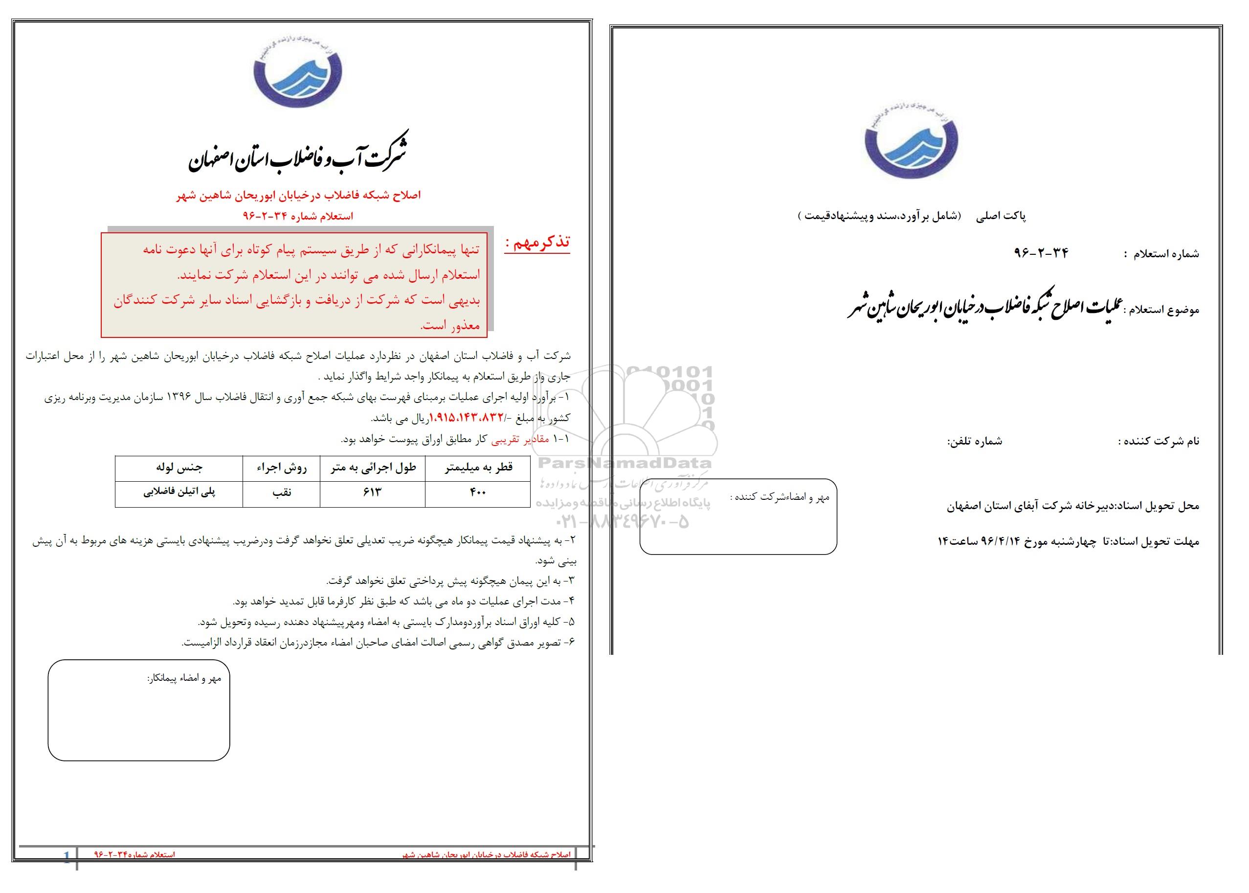 شرکت آب و فاضلاب استان اصفهان در نظر دارد عملیات اصلاح شبکه فاضلاب در خیابان ابوریحان شاهین شهر را از محل اعتبارات جاری و از طریق استعلام به پیمانکار واجدشرایط واگذار نماید.