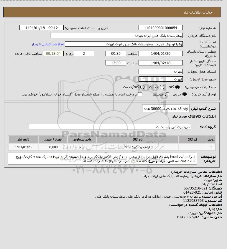 شرح کلی نیاز: لوله cbc k3 تعداد 30000 عدد