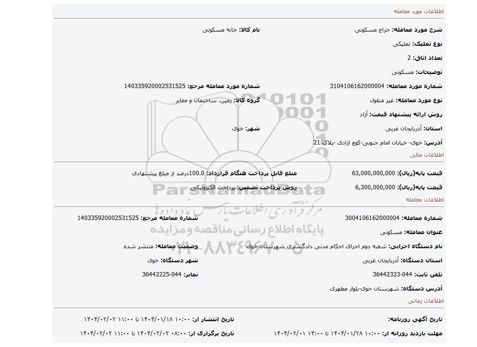 نام دستگاه اجرایی: شعبه دوم اجرای احکام مدنی دادگستری شهرستان خویوضعیت معامله: منتشر شده