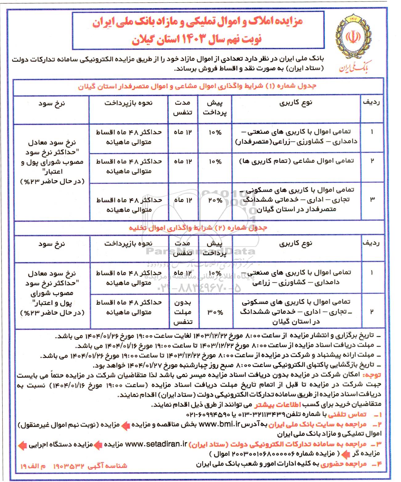 مزایده املاک و اموال تملیکی و مازاد بانک ملی ایران نوبت نهم سال 1403 استان گیلان