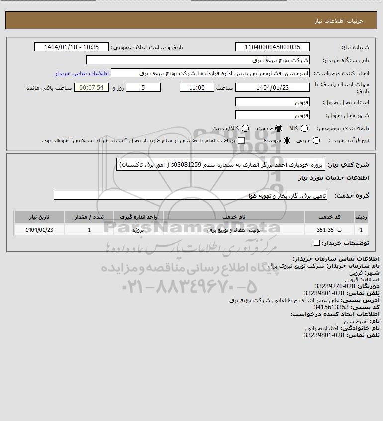 شرح کلی نیاز: پروژه خودیاری احمد برزگر انصاری به شماره سنم s03081259 ( امور برق تاکستان)