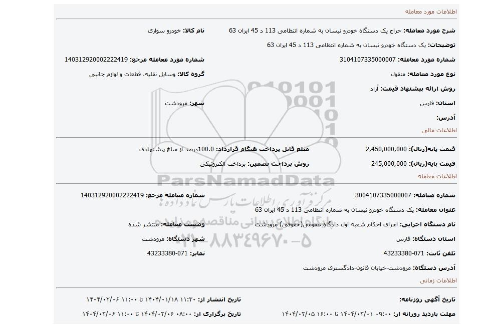 | شرح مورد معامله: حراج یک دستگاه خودرو نیسان به شماره انتظامی 113 د 45 ایران 63 | نام کالا: خودرو سواری | |