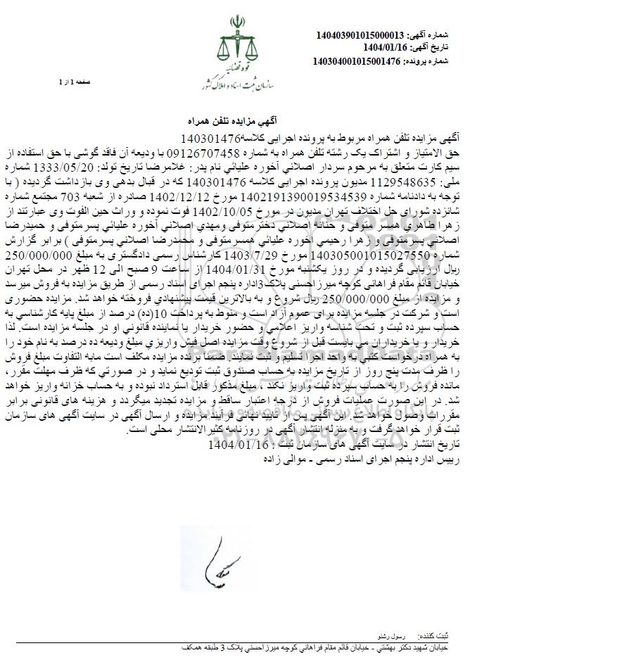 مزایده عمومی مزایده تلفن همراه برگزار میگردد. از کلیه افراد متخصص و شرکتهای واجد شرایط دعوت به عمل میآید تا در این مزایده با کد خبرگزاری پارس نماد : 8839081 شرکت نمایند تاریخ شروع مزایده : 1404/01/18 مهلت شرکت در مزایده: تا پایان روز 1404/01/31 مکان برگزاری اموال واگذاری استانهای تهران و دستهبندیهای مربوط به این حراجی متفرقه, واگذاری و فروش سیم کارت میباشد.