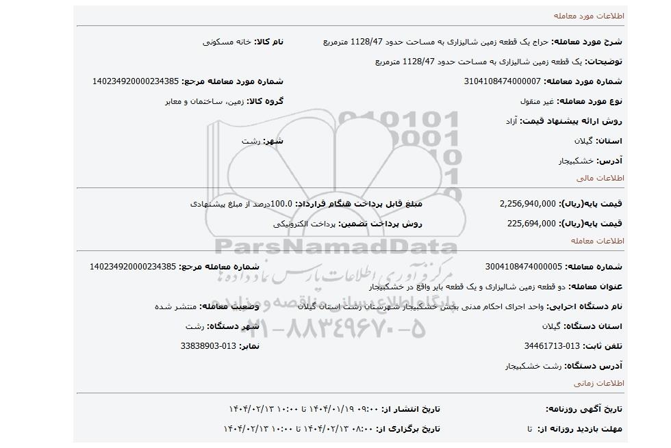 | شرح مورد معامله: حراج یک قطعه زمین شالیزاری به مساحت حدود 1128/47 مترمربع | نام کالا: خانه مسکونی | |
