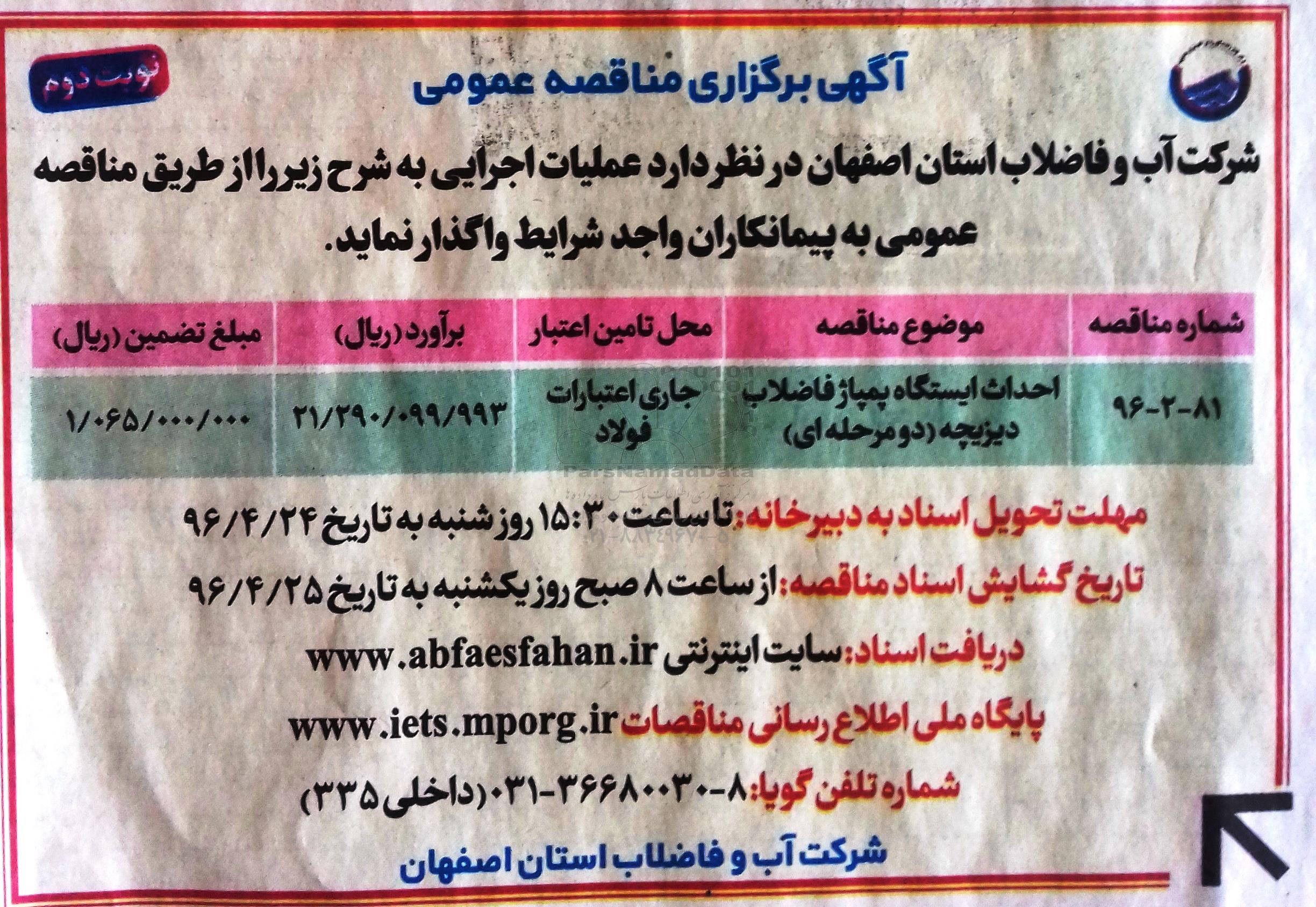 شرکت آب و فاضلاب استان اصفهان در نظر دارد عملیات اجرایی به شرح زیر را از طریق مناقصه عمومی به پیمانکاران واجد شرایط واگذار نماید.