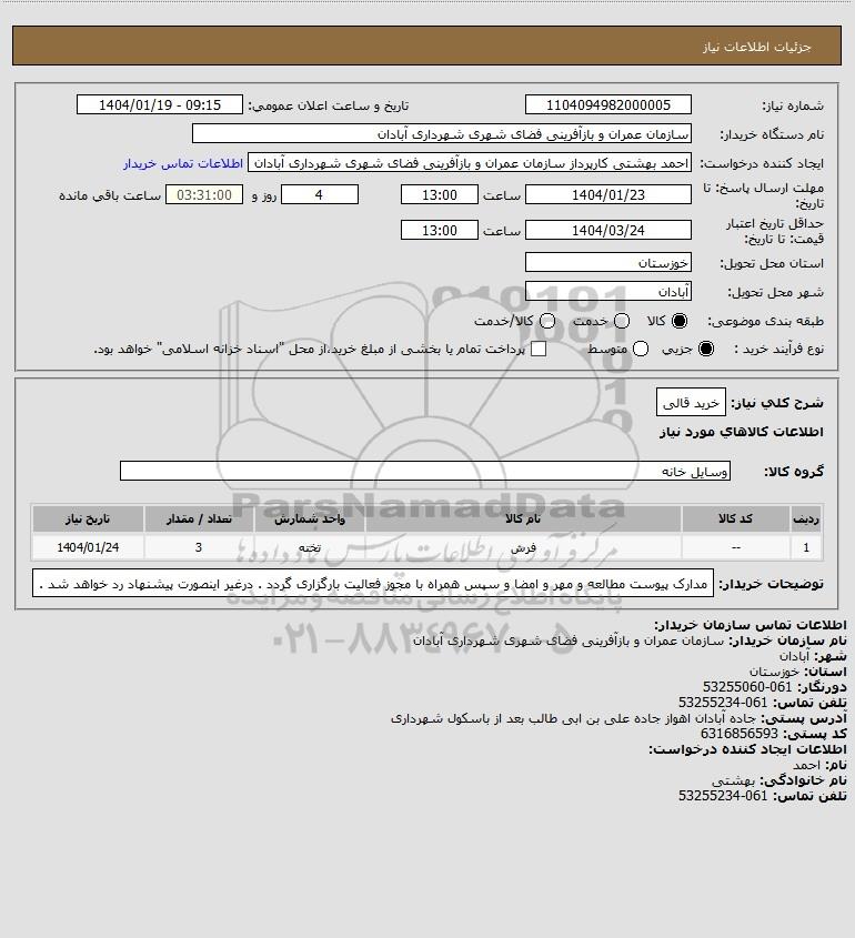 نام دستگاه خریدار:سازمان عمران و بازآفرینی فضای شهری شهرداری آبادان