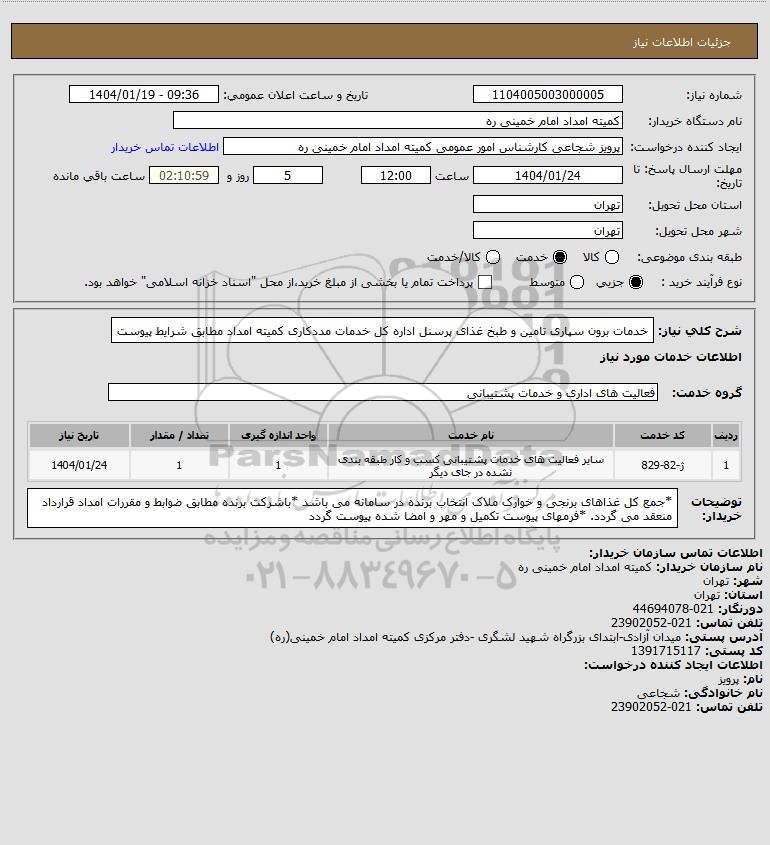 شرح کلی نیاز: خدمات برون سپاری تامین و طبخ غذای پرسنل اداره کل خدمات مددکاری کمیته امداد مطابق شرایط پیوست