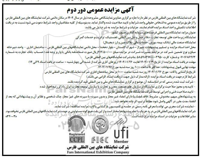 شرکت نمایشگاه های بین المللی فارس در نظر دارد اجازه برگزاری عناوین نمایشگاهی مشروحه ذیل در سال 1404 در مکان دائمی شرکت نمایشگاه های بین المللی فارس را از طریق مزایده عمومی به اشخاص حقوقی واجد شرایط و تایید صلاحیت شده واگذار نماید. بدینوسیله از کلیه متقاضیان واجد شرایط دعوت می شود نسبت به دریافت اطلاعات تکمیلی و اخذ اسناد مزایده اقدام نمایند. جزئیات و شرایط مزایده به شرح ذیل می باشد