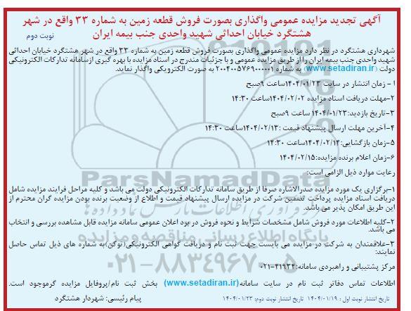 آگهی تجدید مزایده عمومی واگذاری بصورت فروش قطعه زمین به شماره 33 واقع در شهر هشتگرد خیابان احداثی شهید واحدی جنب بیمه ایران