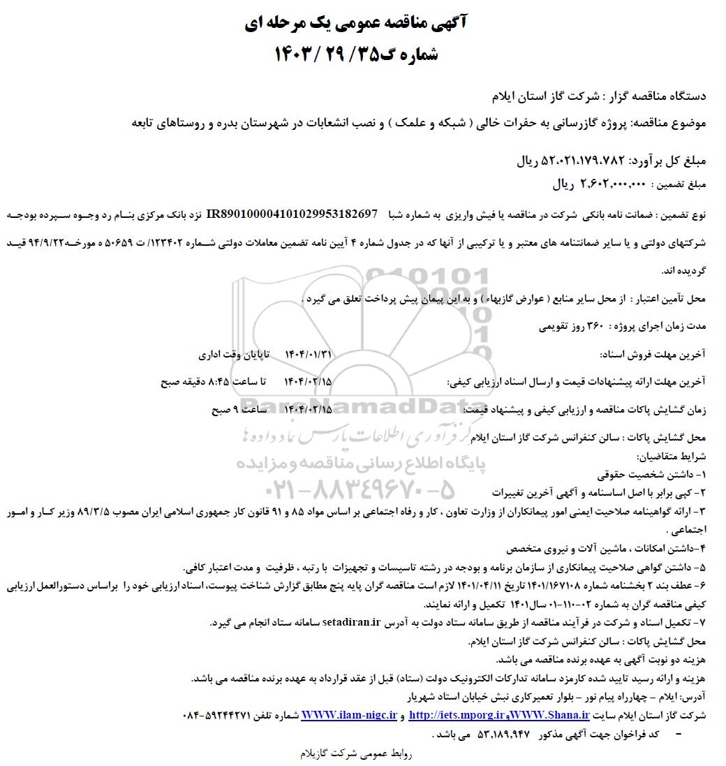 موضوع مناقصه پروژه گازرسانی به حفرات خالی ( شبکه و علمک ) و نصب انشعابات در شهرستان بدره و روستاهای تابعه