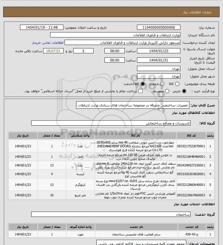 شرح کلی نیاز: تعمیرات ساختمتی متفرقه در مجموعه ساختمان های ستادی وزارت ارتباطات