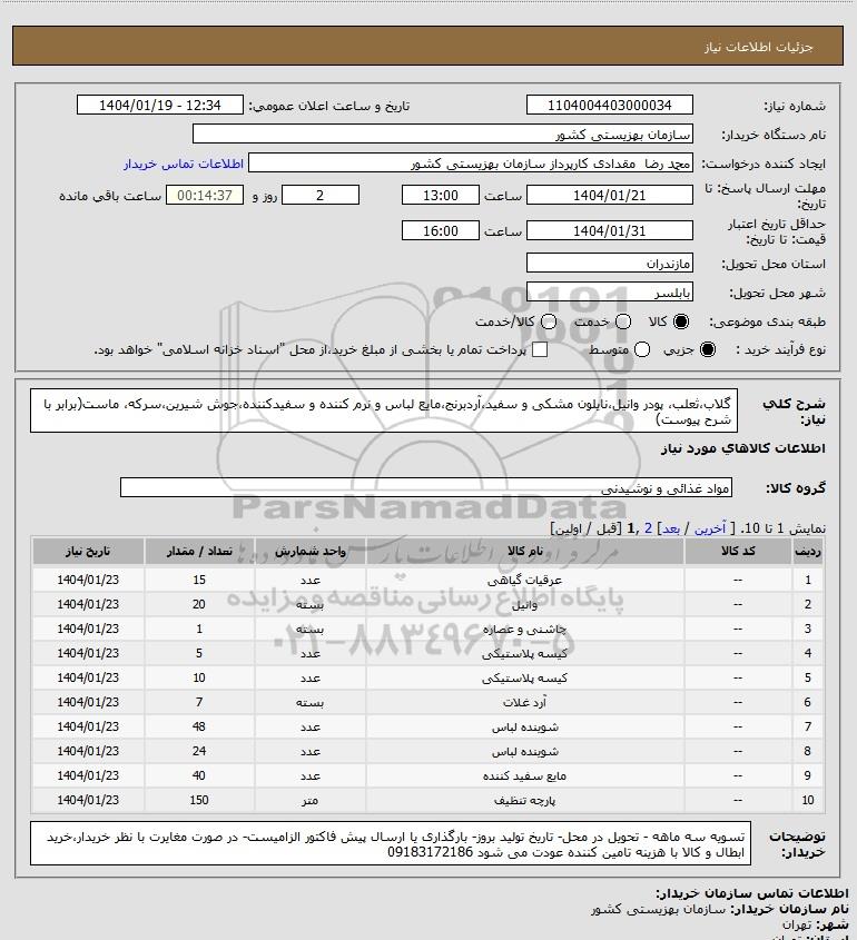 شرح کلی نیاز: گلاب،ثعلب، پودر وانیل،نایلون مشکی و سفید،آردبرنج،مایع لباس و نرم کننده و سفیدکننده،جوش شیرین،سرکه، ماست(برابر با شرح پیوست)