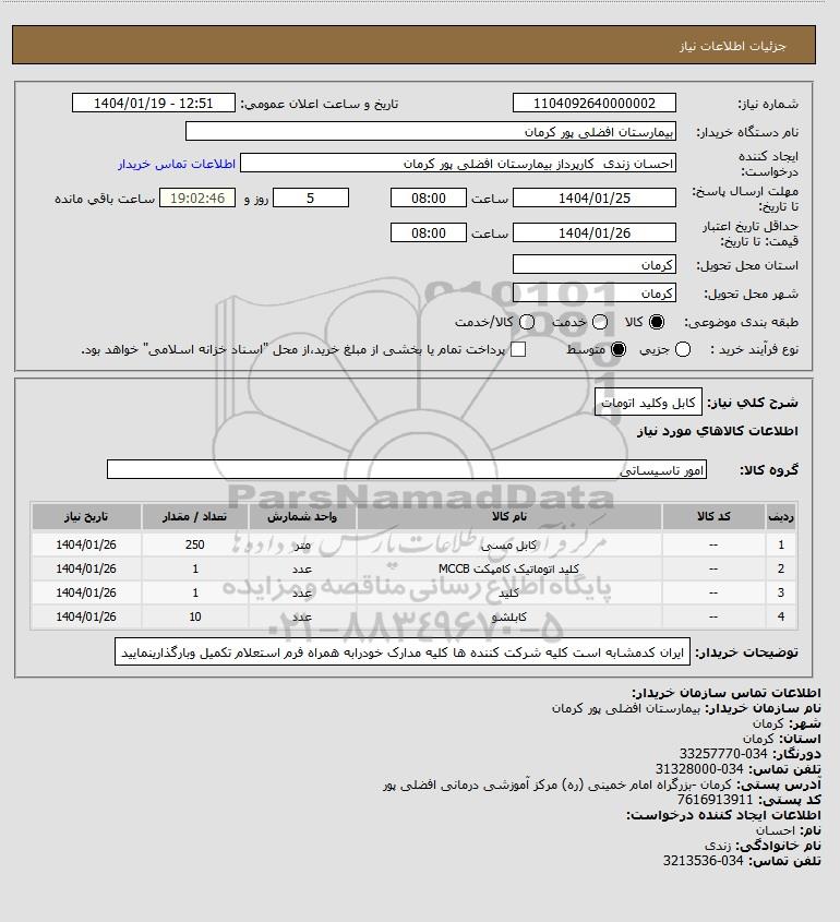 استعلام بها و موضوع استعلام استعلام کابل وکلید اتومات به اطلاع کلیه شرکتها و افراد متخصص واجد شرایط میرساند، آگهی گذار در نظر دارد از طریق استعلام بها، نسبت به انتخاب و دریافت پیشنهادات اقدام نماید. این استعلام با کد آگهی ثبت شده در سامانه خبرگزاری پارس نماد : 8843930 منتشر شده است. مشخصات استعلام : تاریخ شروع استعلام: 1404/01/19 آخرین مهلت ارسال پیشنهاد قیمت : 1404/01/25 و محل اجرای پروژه : استان کرمان میباشد. استعلام قیمت مورد درخواست : استعلام کابل وکلید اتومات با دستهبندیهای تخصصی و گروه های مرتبط : انواع کلید و پریزهای برقی و صنعتی, سیم و کابل, تجهیزات برق و الکترونیک, استعلام اطلاع رسانی میگردد.