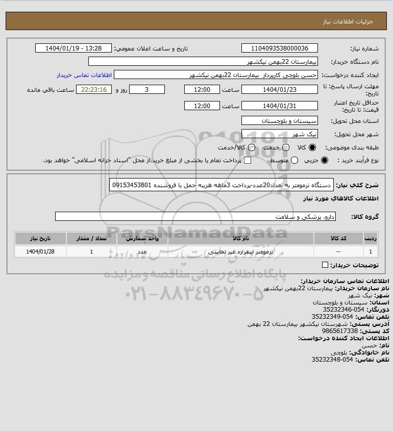شرح کلی نیاز: دستگاه ترمومتر به تعداد20عدد-پرداخت 3ماهه هزینه حمل با فروشنده 09153453801