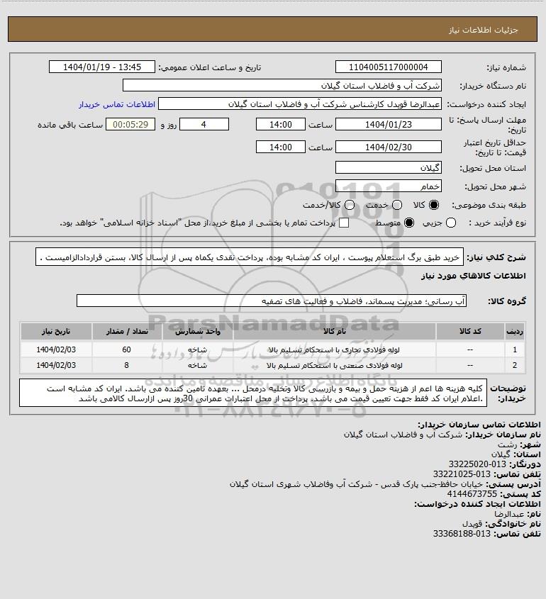 نام دستگاه خریدار:شرکت آب و فاضلاب استان گیلان
