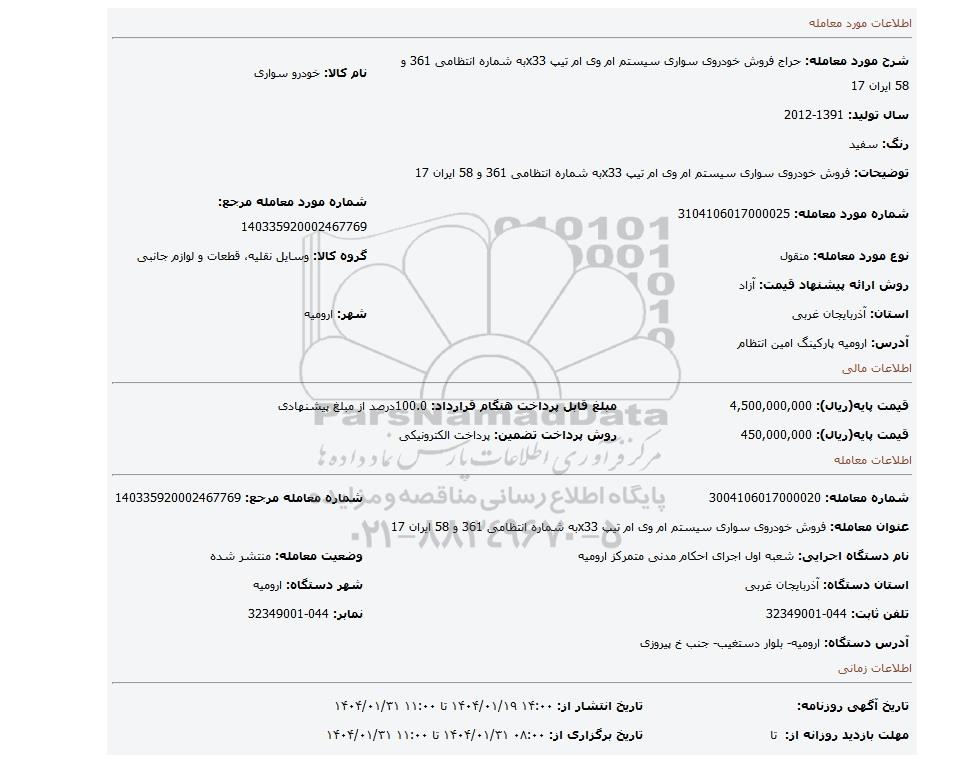 | شرح مورد معامله: حراج فروش خودروی سواری سیستم ام وی ام تیپ x33به شماره انتظامی 361 و 58 ایران 17 | نام کالا: خودرو سواری | |