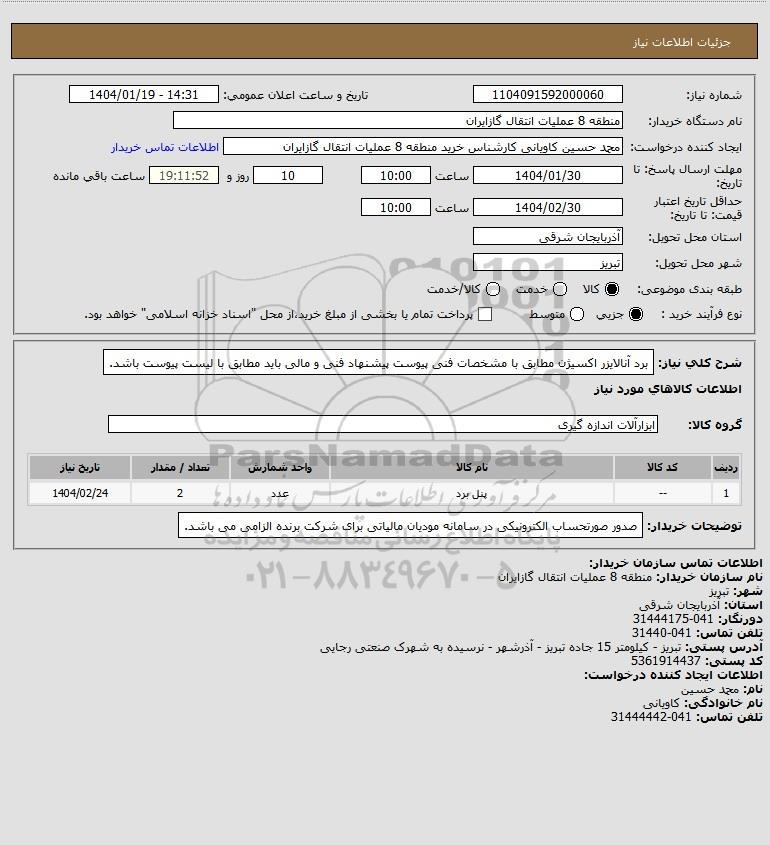 استعلام بها و موضوع استعلام استعلام برد آنالایزر اکسیژن مطابق با مشخصات فنی پیوست پیشنهاد فنی و مالی باید مطابق با لیست پیوست باشد. به اطلاع کلیه شرکتها و افراد متخصص واجد شرایط میرساند، آگهی گذار در نظر دارد از طریق استعلام بها، نسبت به انتخاب و دریافت پیشنهادات اقدام نماید. این استعلام با کد آگهی ثبت شده در سامانه خبرگزاری پارس نماد : 8844783 منتشر شده است. مشخصات استعلام : تاریخ شروع استعلام: 1404/01/19 آخرین مهلت ارسال پیشنهاد قیمت : 1404/01/30 و محل اجرای پروژه : استان آذربایجان شرقی میباشد. استعلام قیمت مورد درخواست : استعلام برد آنالایزر اکسیژن مطابق با مشخصات فنی پیوست پیشنهاد فنی و مالی باید مطابق با لیست پیوست باشد. با دستهبندیهای تخصصی و گروه های مرتبط : ابزار دقیق, انواع تابلو و راکهای مخابراتی و برقی, تجهیزات نفت و گاز, تجهیزات برق و الکترونیک, استعلام اطلاع رسانی میگردد.