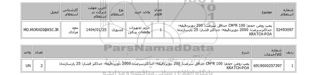 | 52493097 | پمپ روغن حجم: 100 CM³R حداقل سرعت: 200 دوربردقیقه؛ حداکثرسرعت: 2000 دوربردقیقه؛ حداکثر فشار: 25 بارسازنده: KRATCH-POA | 1 | خرید تجهیزات وقطعات یدکی | کشوری | 1404/01/25 | محمد مرادی | MD.MORADI@KSC.IR |