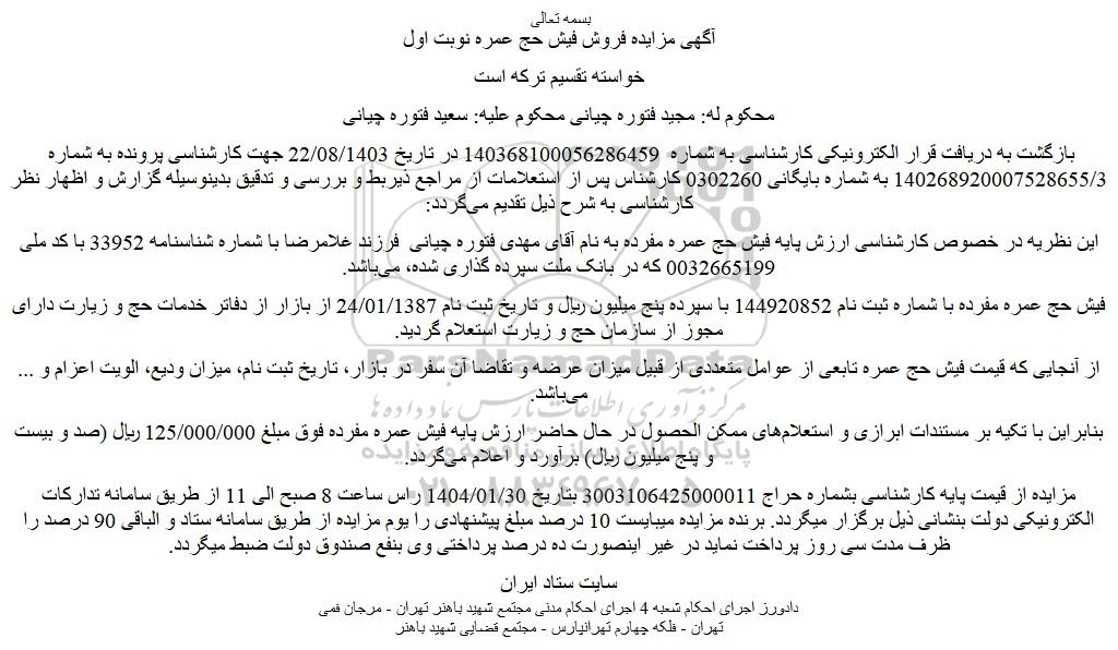 آگهی مزایده فروش فیش حج عمره نوبت اول