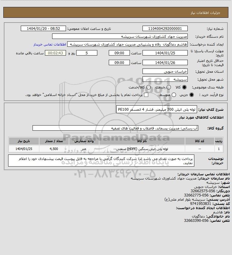 شرح کلی نیاز: لوله پلی اتیلن 200 میلیمتر، فشار 4 اتمسفر PE100
