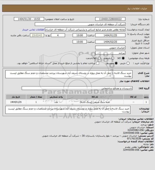 شرح کلی نیاز: خرید سنگ لاشه و حمل آن به محل پروژه در روستای شریف آباد شهرستان بیرجند مشخصات و حجم سنگ مطابق لیست پیوست