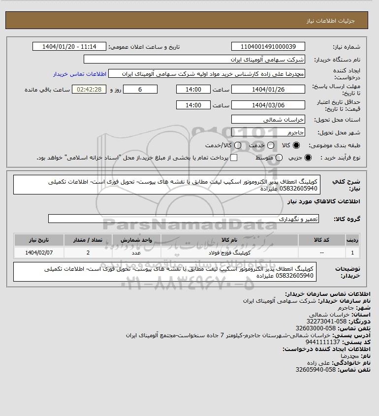 شرح کلی نیاز: کوپلینگ انعطاف پذیر الکتروموتور اسکیپ لیفت مطابق با نقشه های پیوست- تحویل فوری است- اطلاعات تکمیلی 05832605940 علیزاده