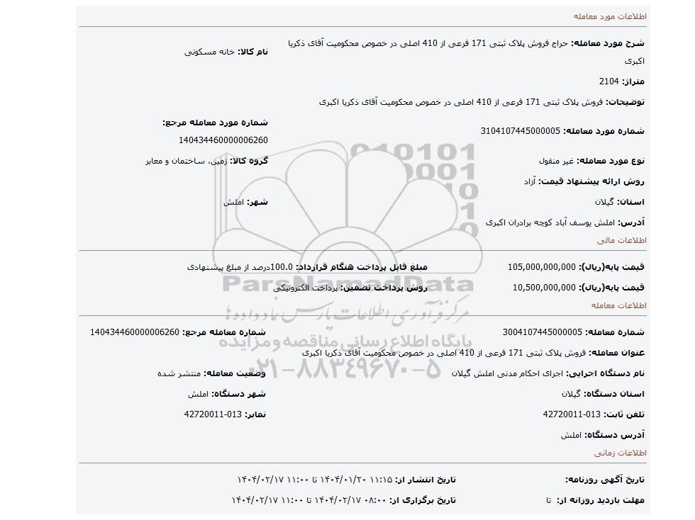 | عنوان معامله: فروش پلاک ثبتی 171 فرعی از 410 اصلی در خصوص محکومیت آقای ذکریا اکبری | ||