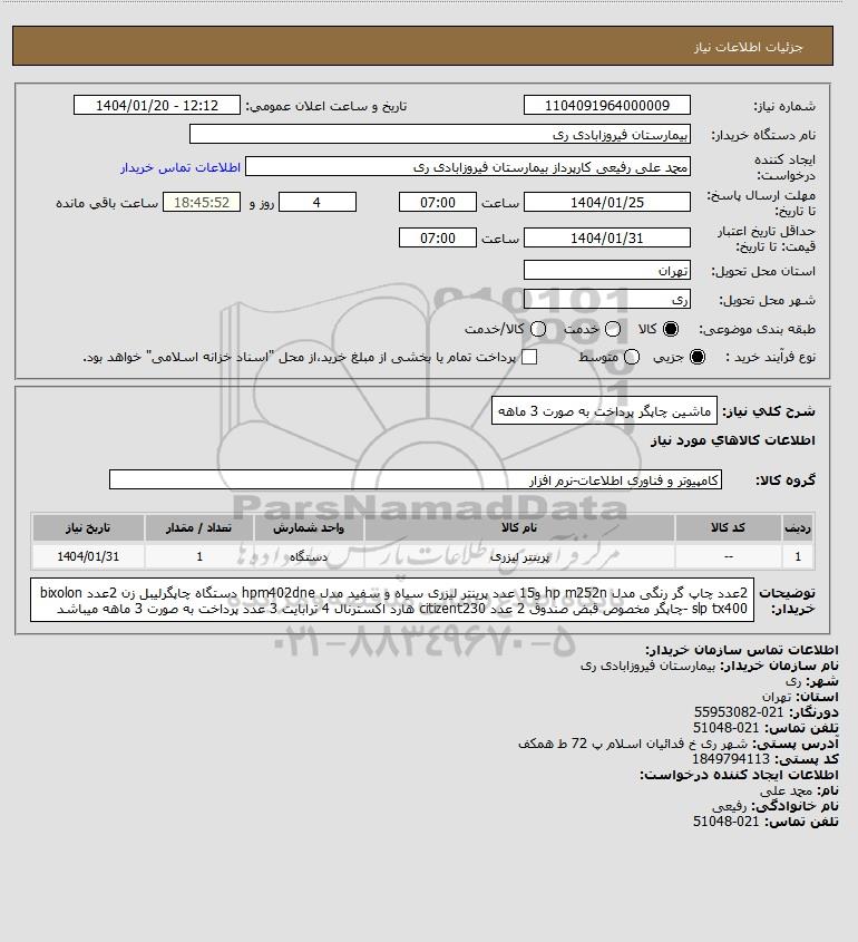 شرح کلی نیاز: ماشین چاپگر پرداخت به صورت 3 ماهه