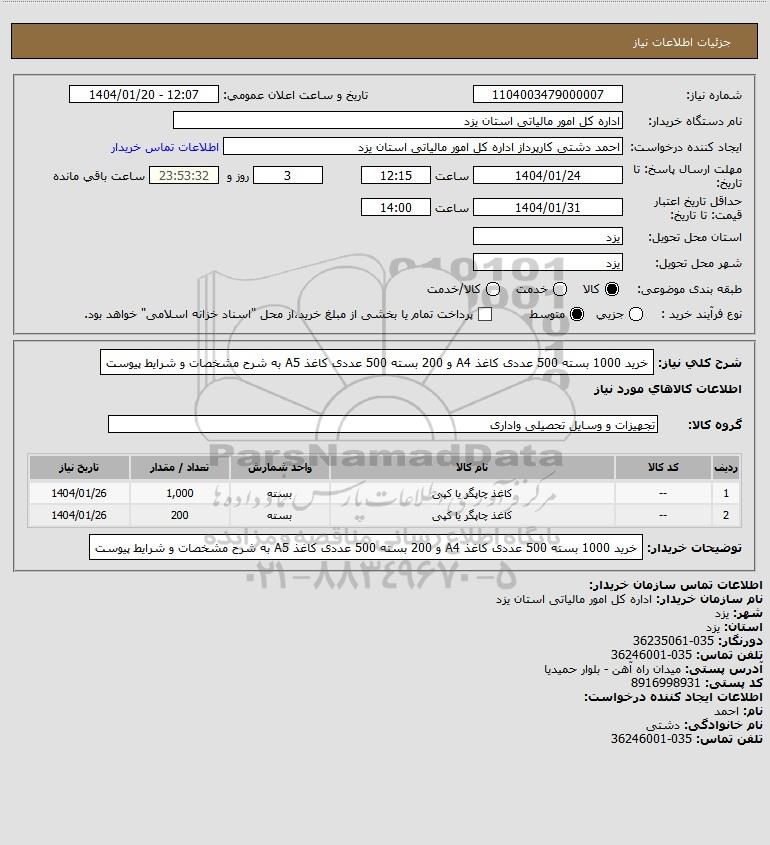 شرح کلی نیاز: خرید 1000 بسته 500 عددی کاغذ A4 و 200 بسته 500 عددی کاغذ A5 به شرح مشخصات و شرایط پیوست