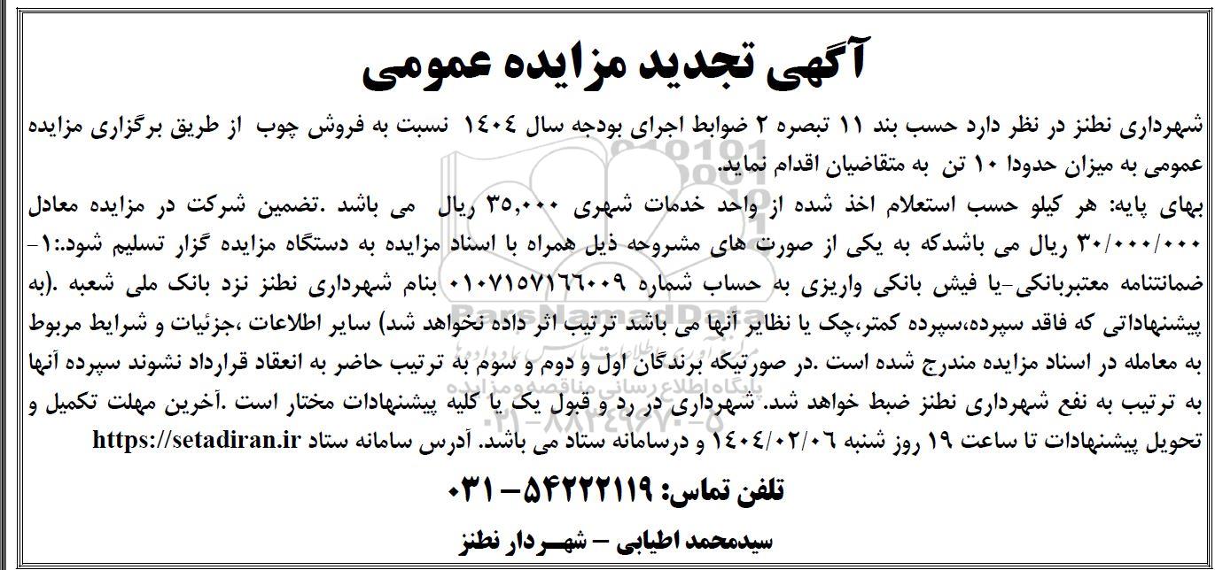 شهرداری نطنز در نظر دارد حسب بند 11 تبصره 2 ضوابط اجرای بودجه سال 1404 نسبت به فروش چوب از طریق برگزاری مزایده عمومی به میزان حدودا 10 تن به متقاضیان اقدام نماید.