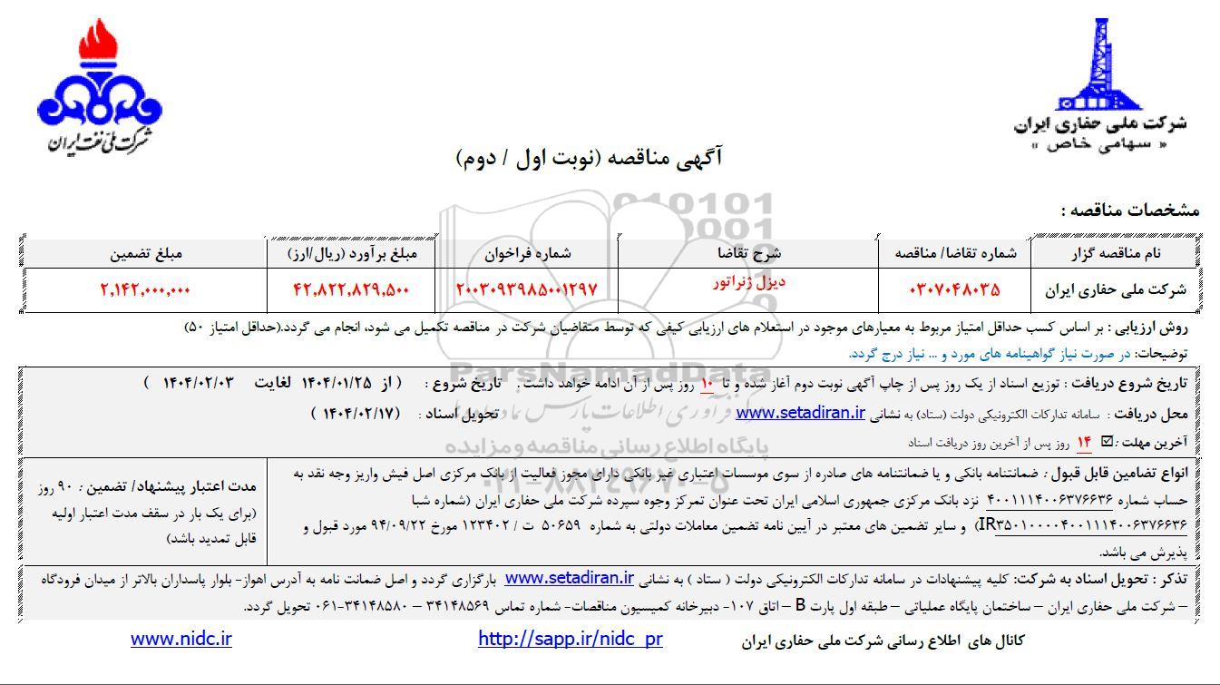 | شرکت ملی حفاری ایران | 0307048035 | دیزل ژنراتور | 2003093685001297 | 42.822.829.500 | 2.142.000.000 |
