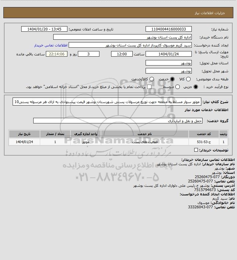 شرح کلی نیاز: موتور سوار مسلط به منطقه جهت توزیع مرسولات پستی شهرستان بوشهر قیمت پیشنهادی به ازای هر مرسوله پستی10