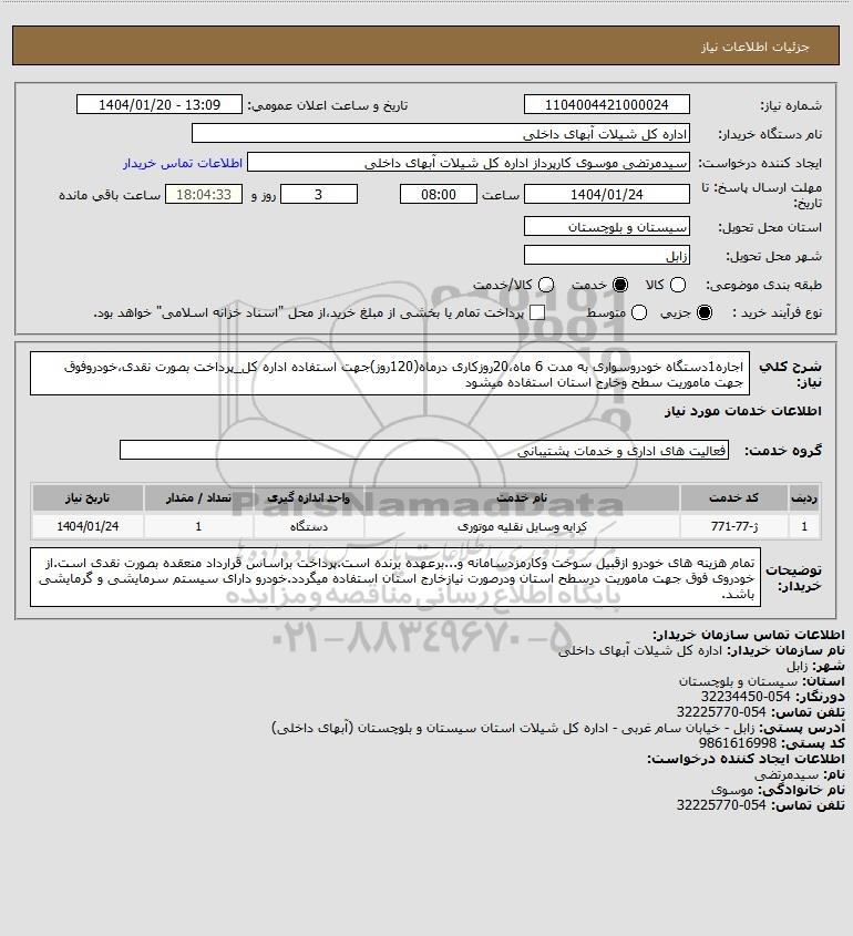 شرح کلی نیاز: اجاره1دستگاه خودروسواری به مدت 6 ماه،20روزکاری درماه(120روز)جهت استفاده اداره کل_پرداخت بصورت نقدی،خودروفوق جهت ماموریت سطح وخارج استان استفاده میشود