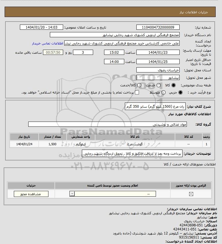 | 1 | -- | گوشت مرغ | کیلوگرم | 1,500 | 1404/01/24 |