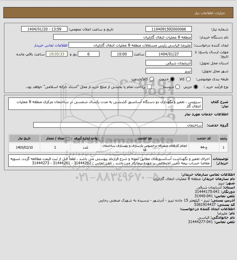 استعلام سرویس تعمیر و نگهداری دو دستگاه آسانسور کششی به مدت یکسال شمسی در ساختمان مرکزی منطقه 8 عملیات انتقال گاز, استعلام سرویس ، تعمیر و نگهداری دو دستگاه آسانسور کششی به مدت یکسال شمسی در ساختمان مرکزی منطقه 8 عملیات انتقال گاز
